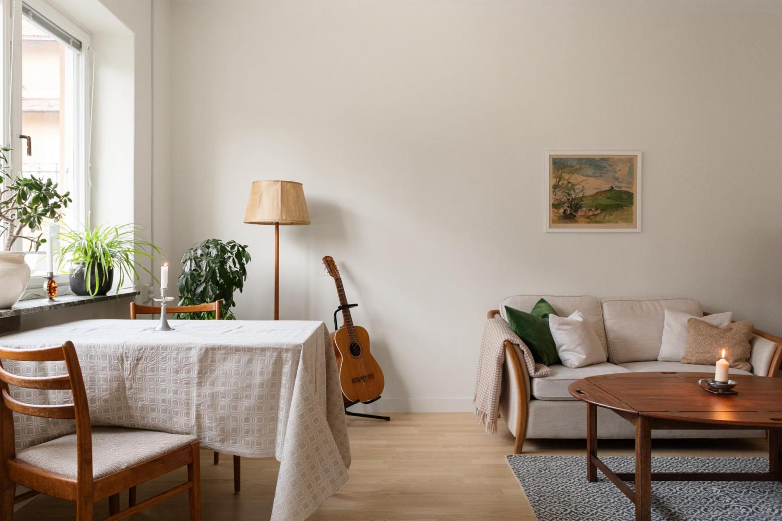 Trivsamt vardagsrum med utsikt mot den vackra malmgården. Stort tredelat fönster i väster ger ett fint ljusinsläpp hela dagen. Persienner finns i både vardagsrum och sovrum. Vardagsrummet har ljust målade väggar.