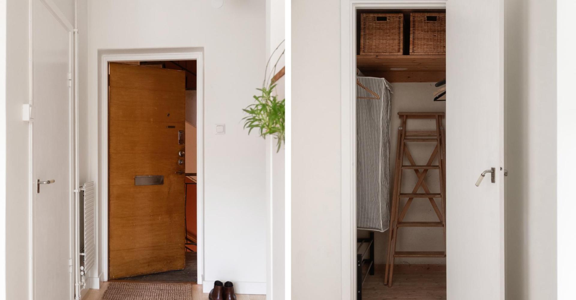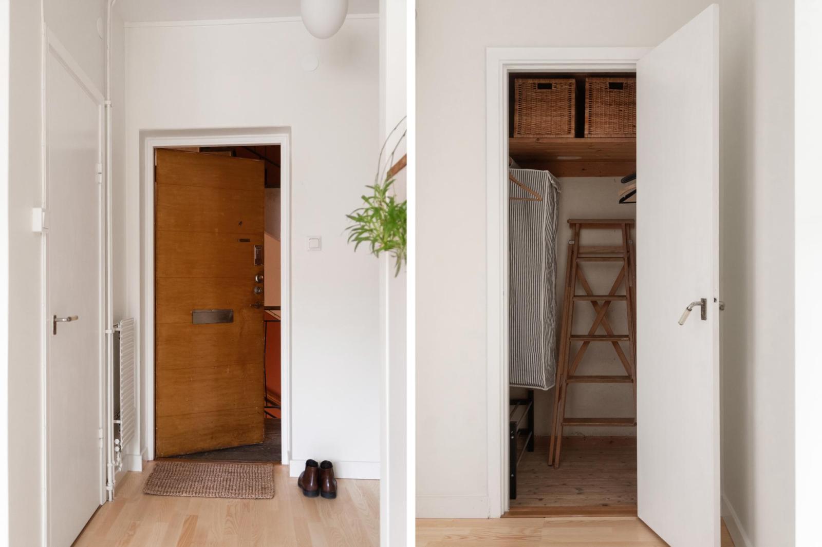 Hall med plats för ytterkläder intill entrén samt en rymlig klädkammare inredd med hyllplan. Väggarna är målade i vit nyans och det är trägolv i ask.