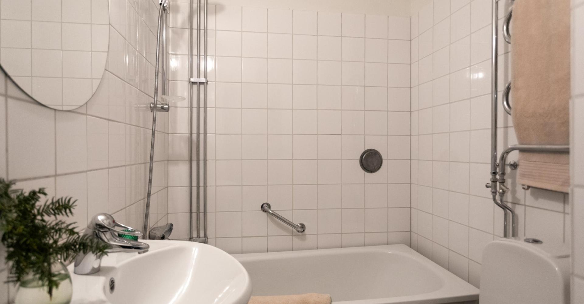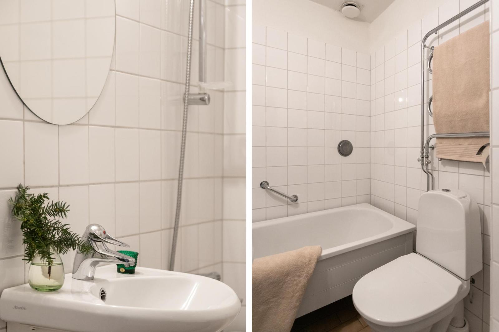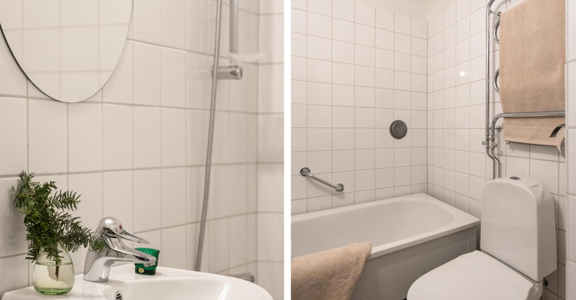 Helkaklat badrum med vitt kakel och sandfärgat klinkers. Här finns wc, tvättställ, spegel, badkar och handduksvärmare.