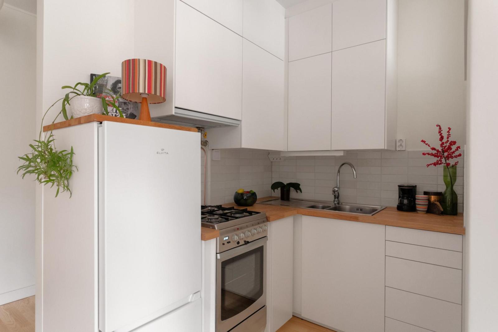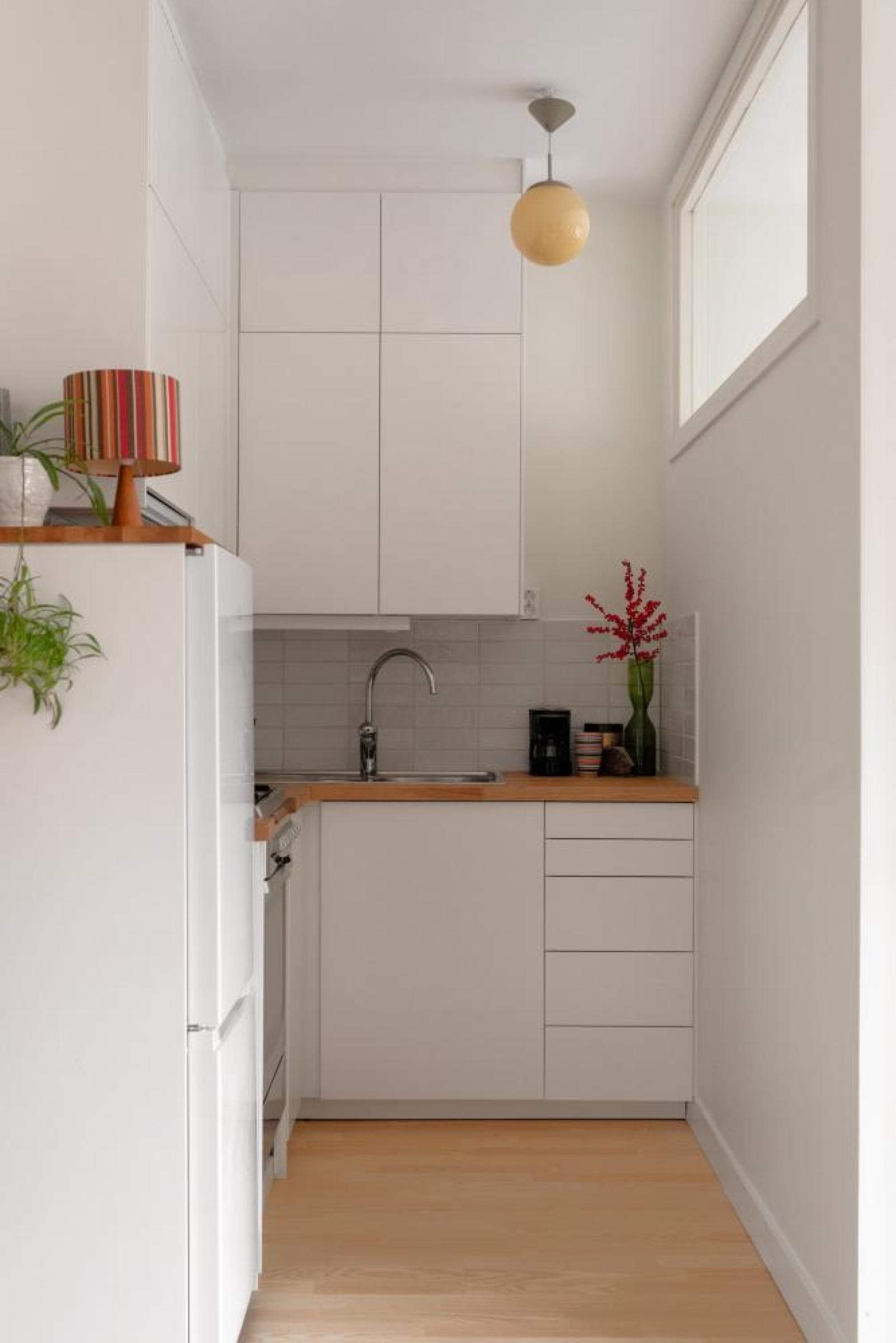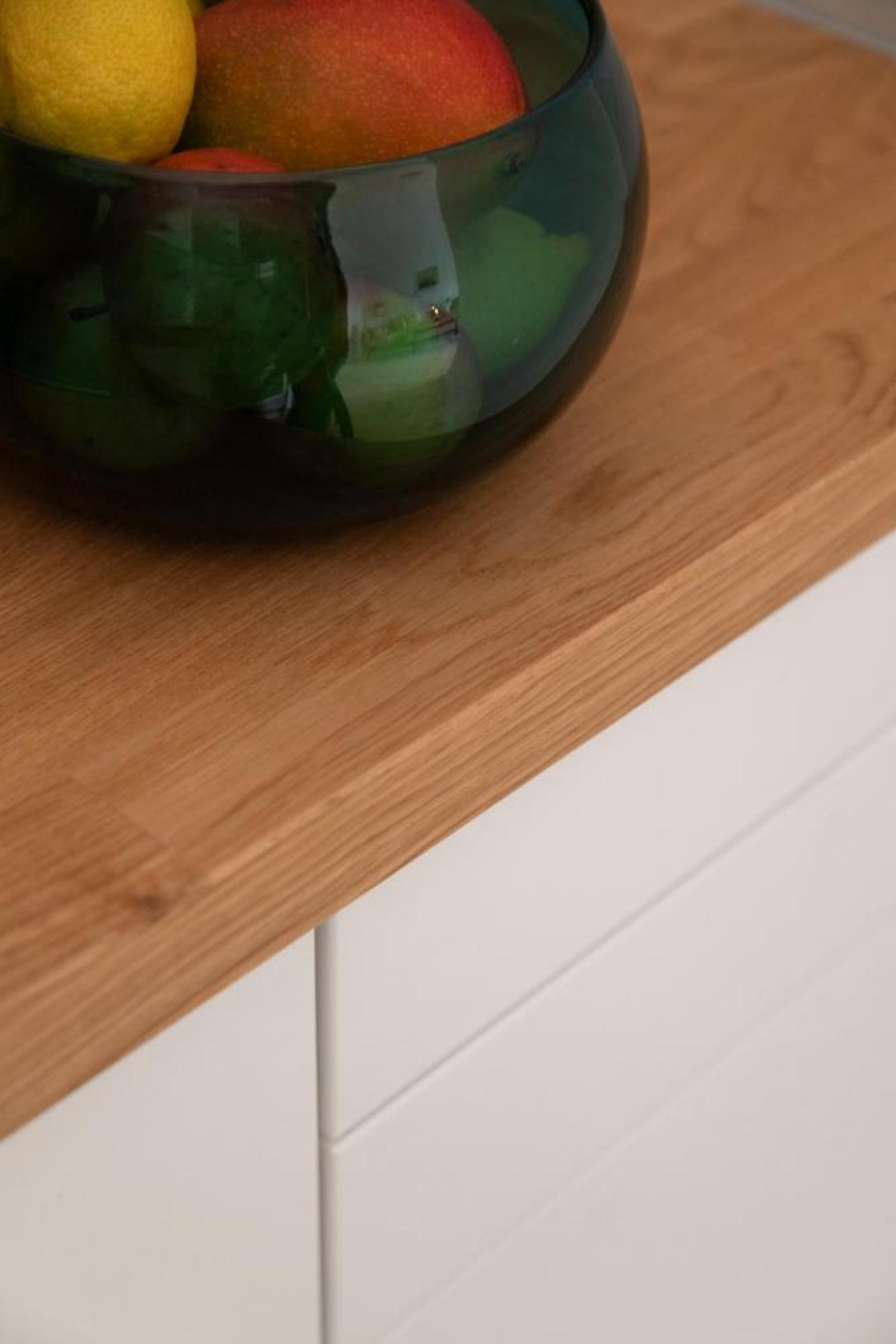 Ljust och trevligt kök! Dagsljuset kommer in via ett glasparti som finns i väggen mot sovrummet intill, samt den breda öppningen mot vardagsrummet. Köket har ljusa skåps- och lådfronter. Utrustningen består av gasspis med elugn, fläkt, kyl och frys. Genomtänkt belysning och flera elkontakter finns också. Golv i ask samt ljust kakel ovan disk- och arbetsbänken som är i ek.